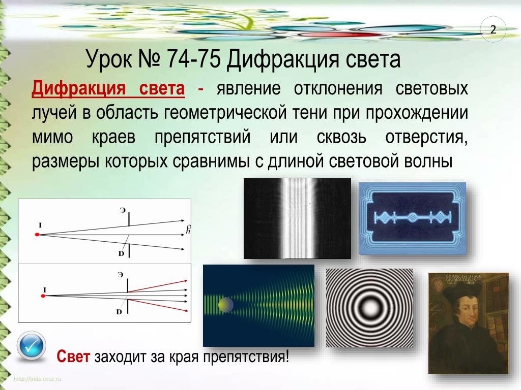 Когда мы говорили об интерференции двух щелей, мы делали вид, что только одна световая волна может пройти через каждую щель за раз.Если вместо этого мы поймем, что несколько световых волн проходят через каждую из двух щелей одновременно, то мы увидим, что для каждой отдельной щели будет картина дифракции (в дополнение к интерференционной картине с двумя щелями). Поскольку две щели расположены близко друг к другу, а их дифракционные картины широкие, их индивидуальные дифракционные картины похожи, и мы можем объединить две дифракционные картины, чтобы получить ту же самую «однощелевую» дифракционную картину, которую мы получили для одной щели.