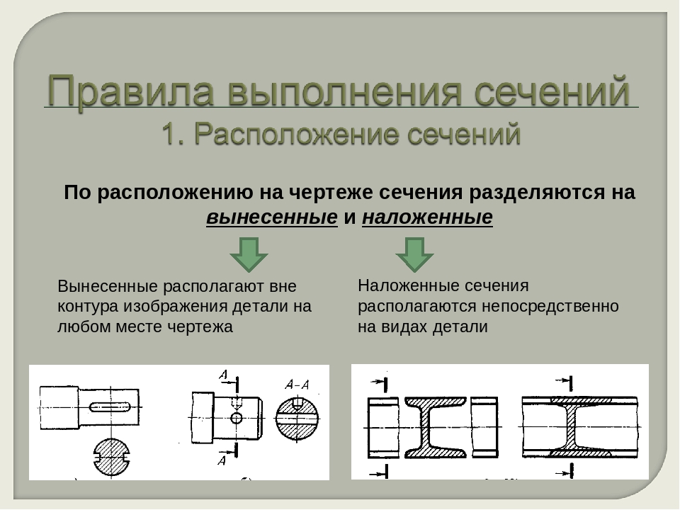 Сечением называется изображение фигуры, получающейся при мысленном рассечении предмета плоскостью (или несколькими плоскостями). На сечении показывается только то, что получается непосредственно в секущей плоскости.