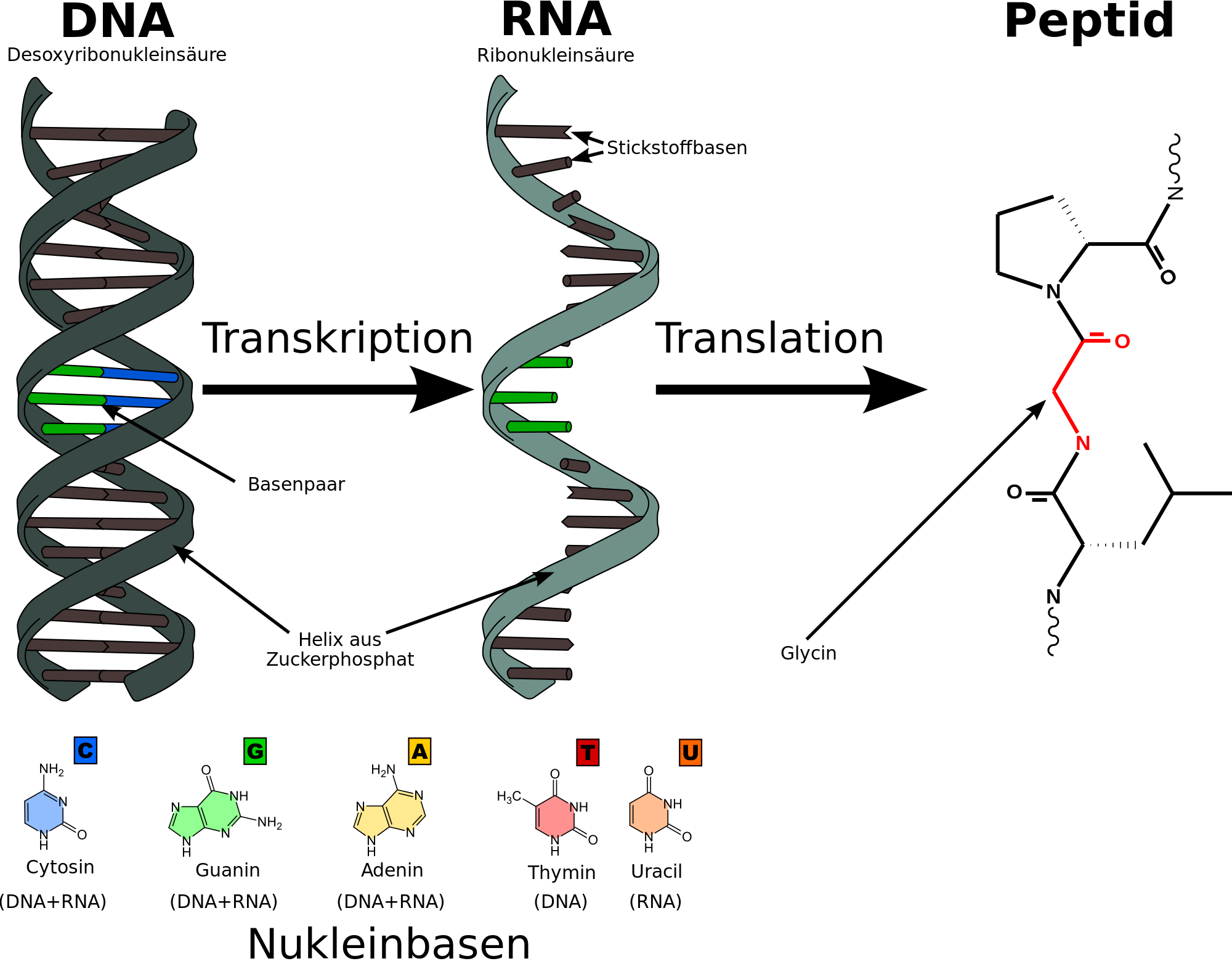 Основания | Основания в ДНК – это аденин («A»), тимин («T»), гуанин («G») и цитозин («C»). | РНК разделяет аденин («A»), гуанин («G») и цитозин («C») с ДНК, но содержит урацил («U»), а не тимин. | |||