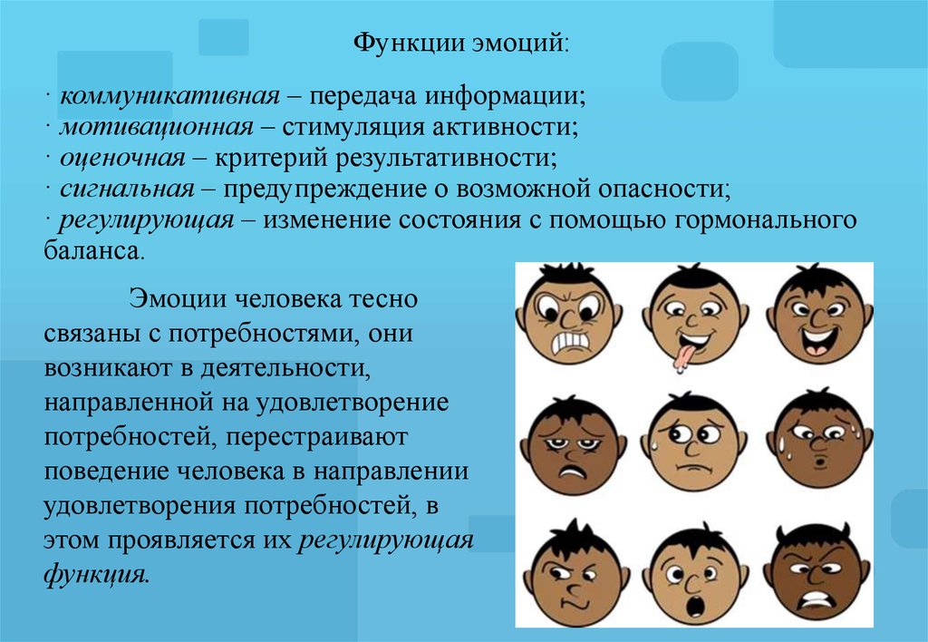 Чувства и эмоции обладают рядом установленных функций. Первоначально, чувства и эмоции, являют собой отображение истинной действительности, однако лишь в форме переживания. Причем определения “чувства” и “эмоции”, зачастую используемые “в быту” как равносильные, в действительности означают разнообразные психические явления, безусловно, наиболее непосредственно связанные меж собой. Как в чувствах, так и в эмоциях отображаются человеческие потребности, а именно, то, как удовлетворяются данные потребности.