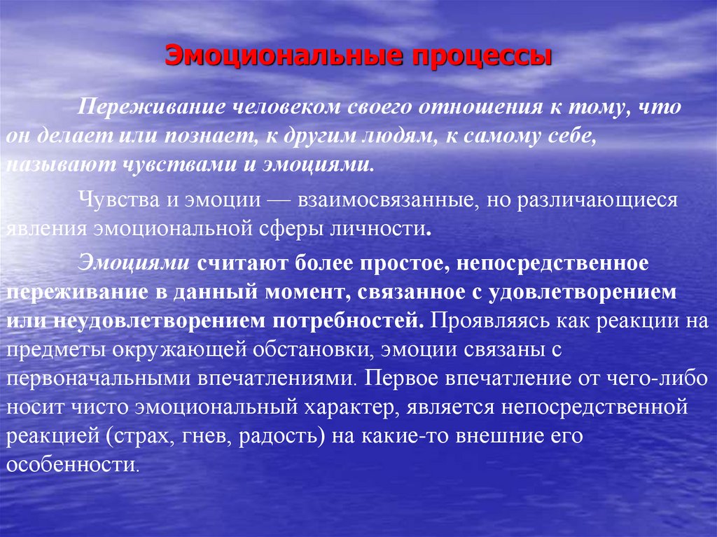В психологии эмоции определяют в виде переживания человеком в текущем моменте собственного отношения к чему-либо. Кроме данного неполного осмысления, понятием “эмоция” пользуются и в обширном смысле, имея в виду цельную эмоциональную реакцию личности, содержащую психологический элемент – переживание, а также своеобразные физиологические изменения в организме, сопровождающие данное переживание. В данном случае можно говорить об эмоциональном состоянии человека.