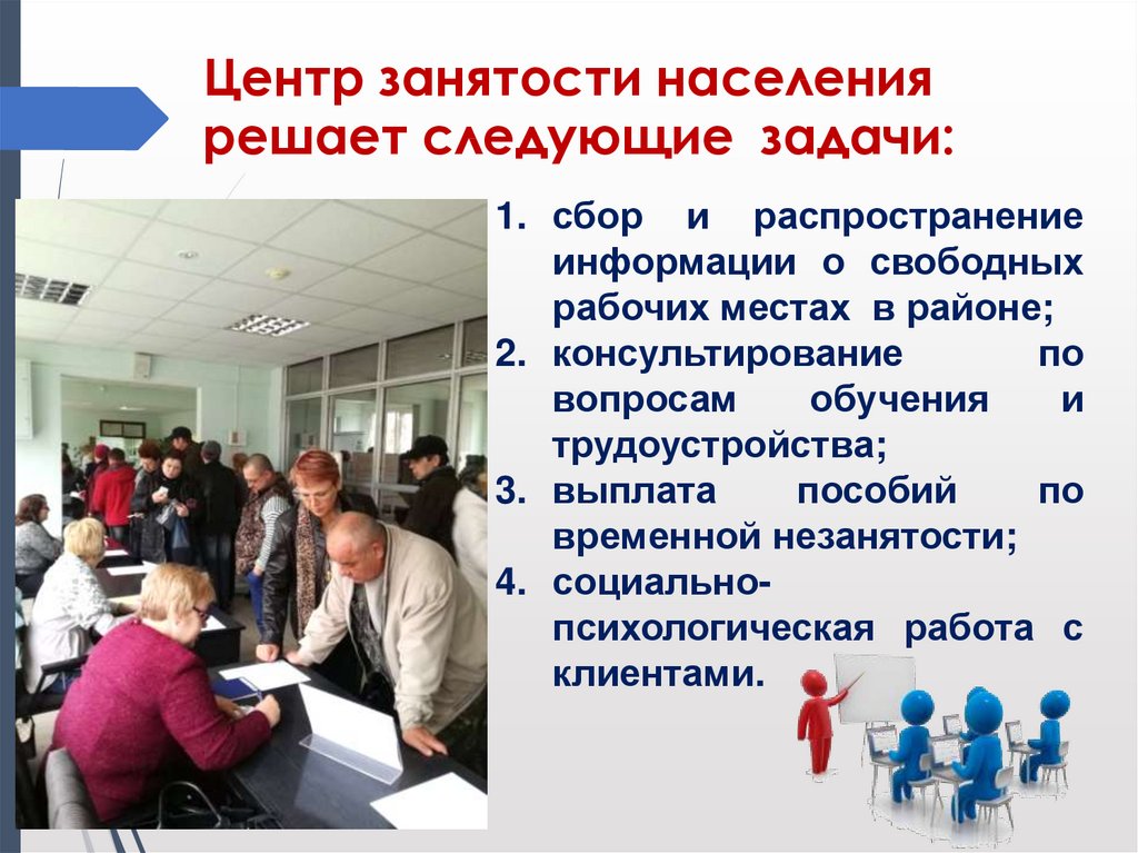 Центр занятости оказывает услуги по трудоустройству на безвозмездной основе: подбирает для безработного гражданина подходящие его специальности вакансии, выплачивает пособия, дает направление на курсы переквалификации.