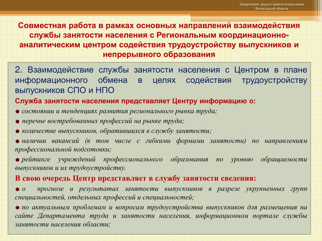 1.7. Департамент является правопреемником переименованных: управления занятости населения Воронежской по вопросам содействия занятости населения, организации и координации работы по определению потребности в привлечении иностранных работников и подготовке предложений по объемам квот на осуществление иностранными гражданами трудовой деятельности в Российской Федерации, по оказанию содействия добровольному переселению в Воронежскую область соотечественников, проживающих за рубежом, по установлению минимального количества специальных рабочих мест для трудоустройства инвалидов и по участию в организации альтернативной гражданской службы на территории Воронежской области, а также по осуществлению социальных выплат гражданам, признанным в установленном порядке безработными; департамента труда и социального развития Воронежской области по вопросам разработки и реализации государственной политики в сферах труда, социального партнерства, уровня жизни и доходов населения, оплаты труда, демографии, развития трудовых ресурсов, охраны труда, государственной экспертизы условий труда.