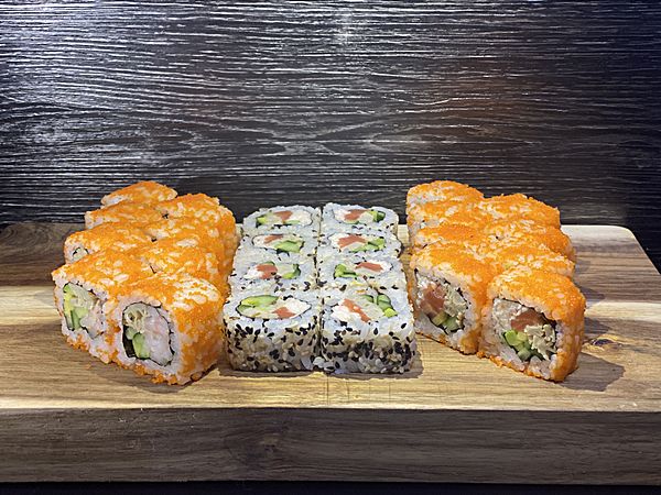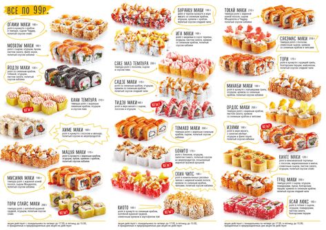 ролл Футо Текка спайс; ролл Тобико Рэд; ролл Тобико Грин; ролл Токуан; ролл сяке кунсей икура чиз; ролл сяке маки; ролл капа маки; хенд ролл эби; хенд ролл ясай; хенд ролл сяке; хенд ролл тай; суси гунканы чука; сусу гунканы масага; суси тай; суси сяке; суси унаги