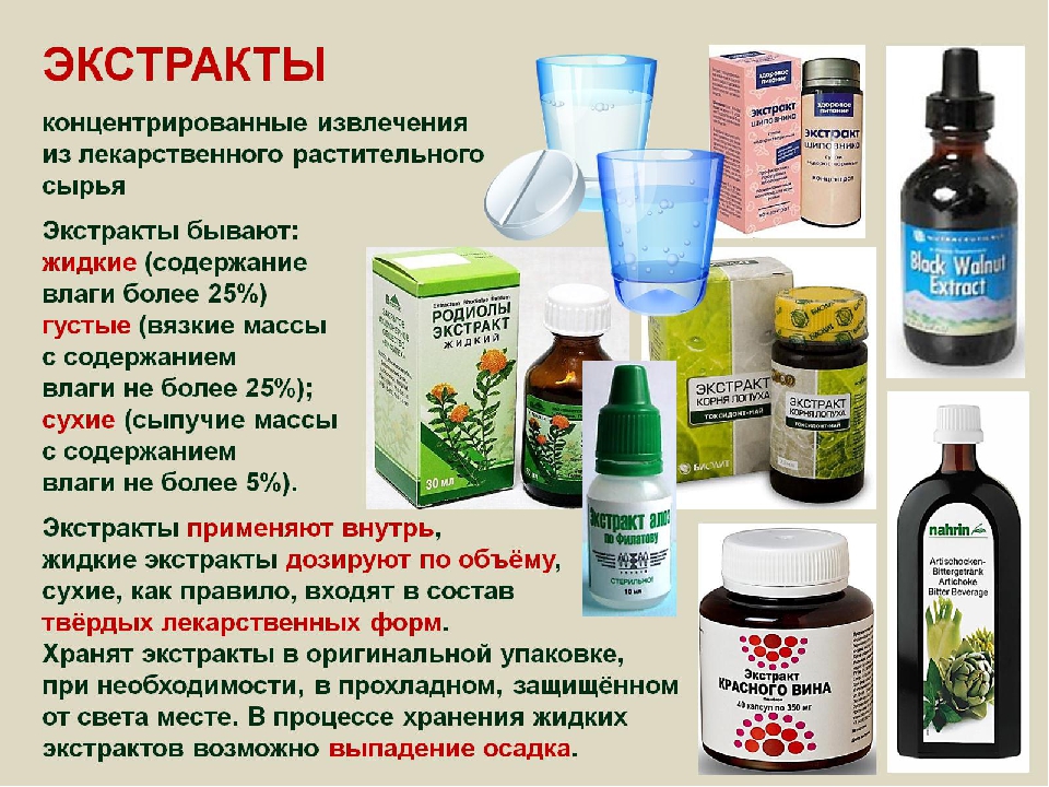 Экстракты жидкие это жидкие концентрированные водно-спиртовые извлечения из ЛРС, получаемые в соотношении 1:1. На фармацевтических предприятиях жидкие экстракты готовят по массе (из 1 кг сырья получают 1 кг жидкого экстракта).