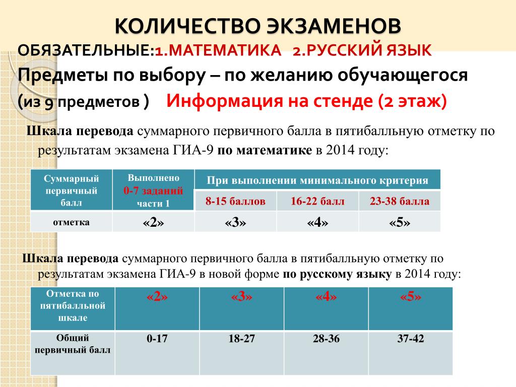 ГИА в форме ОГЭ (основной государственный экзамен) проводится для девятиклассников по двум обязательным предметам (русский язык и математика) и двум предметам по выбору: физике, химии, информатике и информационно-коммуникационным технологиям (ИКТ), биологии, истории, географии, английскому языку, немецкому языку, французскому языку, испанскому языку, литературе, обществознанию. Результаты ОГЭ оцениваются по пятибалльной шкале. Успешное прохождение ОГЭ дает право на получение аттестата об основном общем образовании и продолжение обучения в школе или организации среднего профессионального образования.