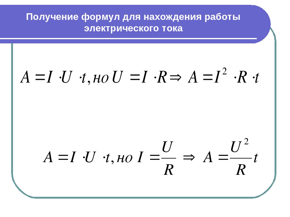 Работа A электрического тока I, протекающего по неподвижному проводнику с сопротивлением R, преобразуется в теплоту Q, выделяющееся на проводнике. Эту работу можно рассчитать по одной из формул (с учетом закона Ома все они следуют друг из друга):