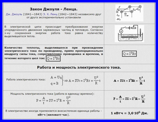 Закон преобразования работы тока в тепло был экспериментально установлен независимо друг от друга Дж.Джоулем и Э.Ленцем и носит название закона Джоуля–Ленца. Мощность электрического тока равна отношению работы тока A к интервалу времени Δt, за которое эта работа была совершена, поэтому она может быть рассчитана по следующим формулам: