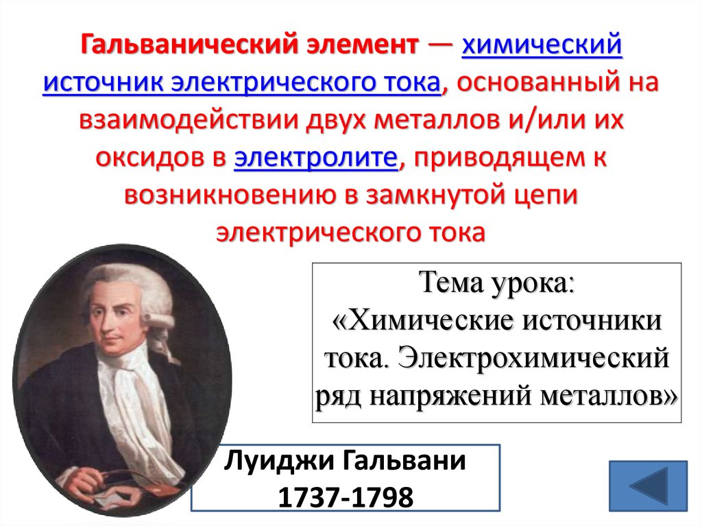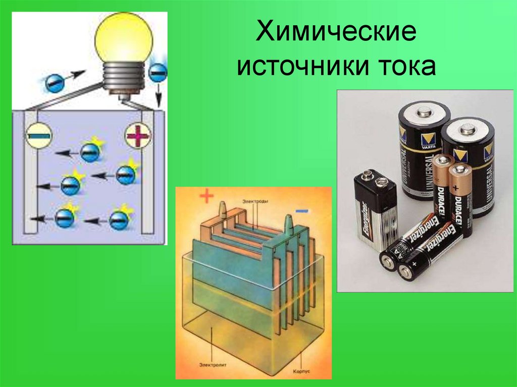 • Химический источник тока — внутренняя энергия преобразуется в электрическую в результате протекающих химических реакций.