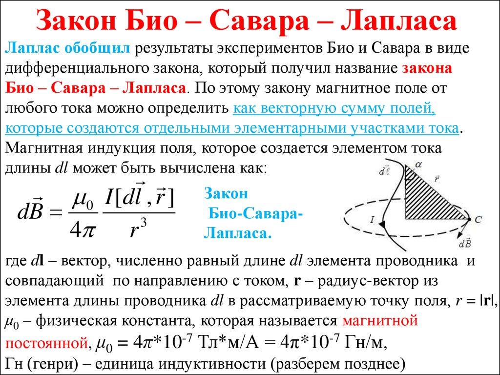 Закон Био-Савара-Лапласа дает возможность вычислять величину полной напряженности магнитного поля, которое создает ток, текущий по проводнику любой формы.