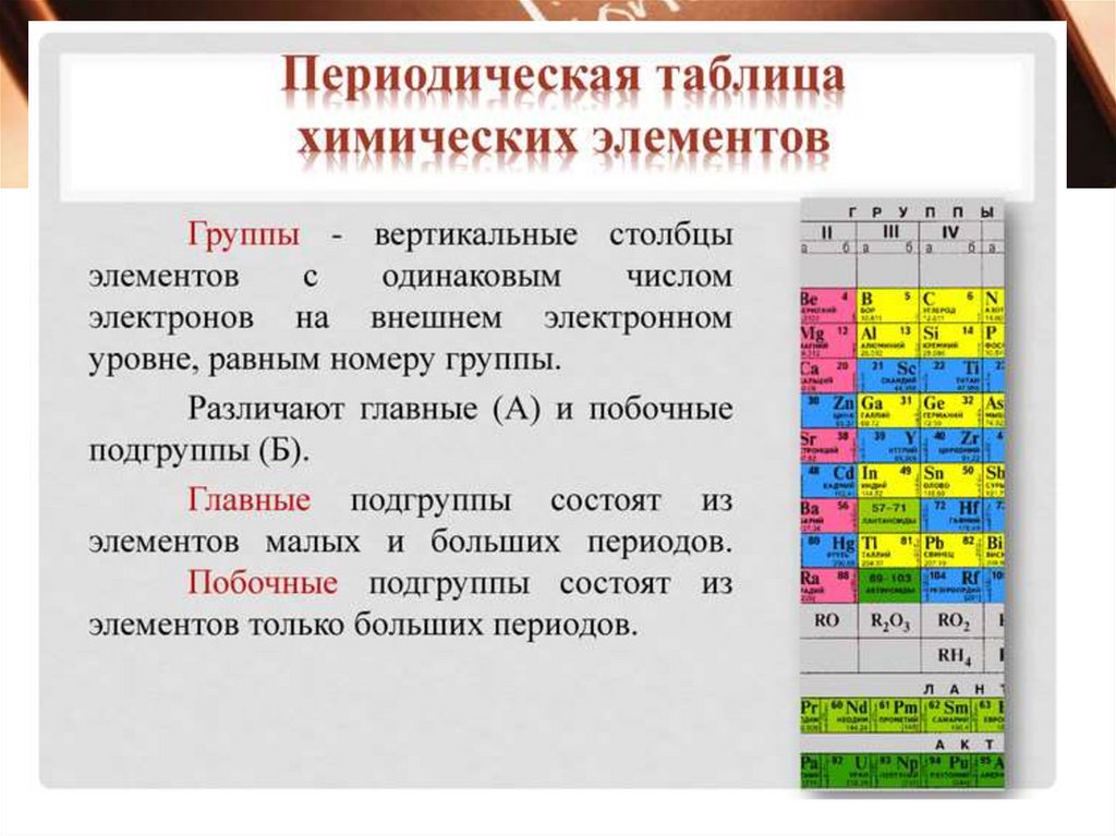 Таблица представляет собой классификацию химических элементов, устанавливающую зависимость свойств элементов от заряда атомного ядра. По сути, это графическое выражение периодического закона, установленного Менделеевым. Первоначально таблица строилась так, что отображала свойства элемента от его атомного веса. Впоследствии было предложено множество ее различных начертаний. Современный вариант представляет собой двухмерную таблицу, в которой столбцы определяют основные физико-химические свойства, а строки — периоды, подобные друг другу.