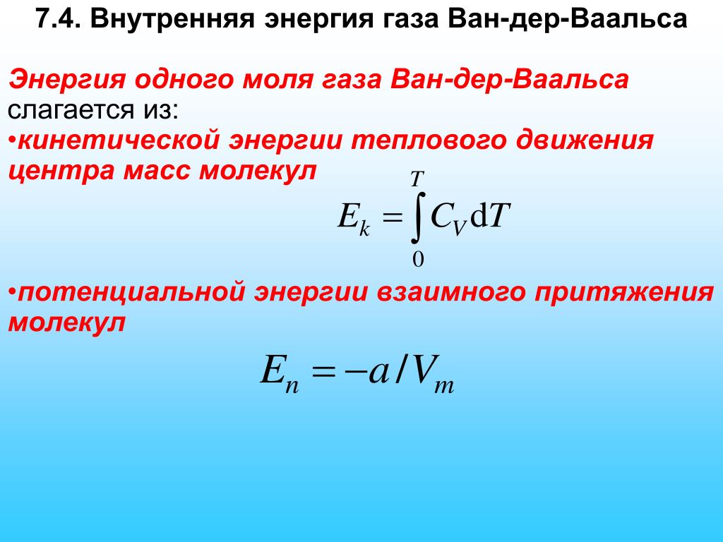 Чтобы на практике использовать формулу изменения внутренней энергии, нужно учесть, что итоговый результат во многом зависит от температуры. Средняя потенциальная энергия взаимодействия молекул у реальных газов, твёрдых тел и жидкостей не равна нулю. Всё зависит от объёма вещества. В каждой ситуации можно наблюдать разное расстояние между молекулами. В термодинамике ВЭ реального газа зависит от объёма V и температуры T. Аналогичное правило действует и по отношению к макроскопическим телам.