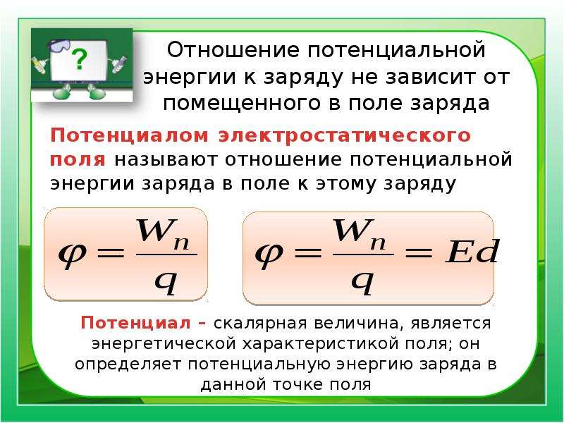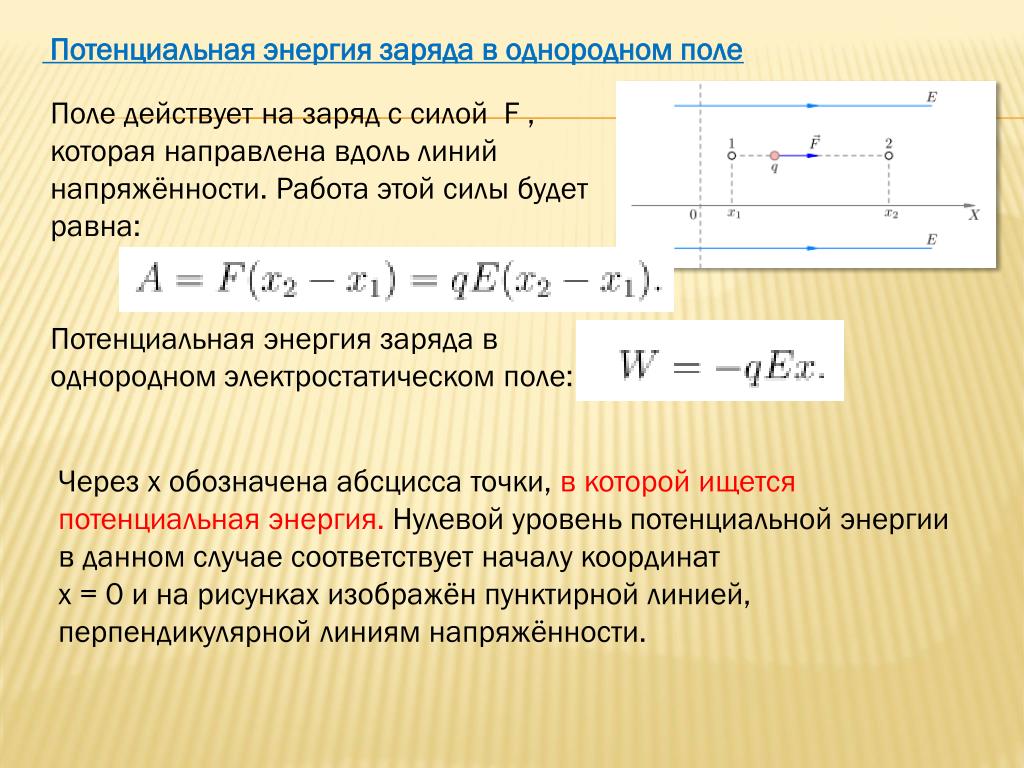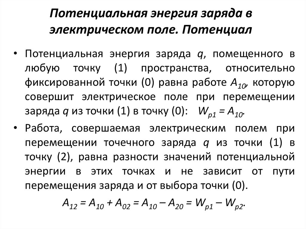 Как и сила, потенциальная энергия представляет собой взаимодействие и требует как минимум двух зарядов. Нет смысла говорить о потенциальной энергии заряда 45 мкКл, если вы не укажете его положение в поле, созданном другими зарядами. Точно так же нет смысла говорить о гравитационной потенциальной энергии шара весом 1 кг, если вы также не укажете его высоту выше контрольного уровня.В электрических системах, чтобы иметь силу или потенциальную энергию, требуются два или более заряда.