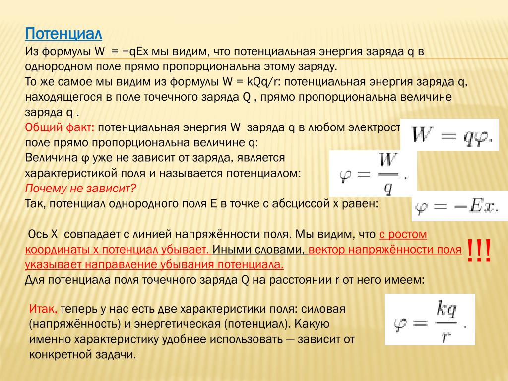 Обратите внимание, что электрическая потенциальная энергия положительна, если два заряда одного типа, положительного или отрицательного, и отрицательная, если два заряда имеют противоположные типы.Это имеет смысл, если вы думаете об изменении потенциальной энергии, когда вы приближаете два заряда или отдаете их друг от друга. В зависимости от относительных типов зарядов вам, возможно, придется работать с системой, или система будет работать на вас, то есть ваша работа будет либо положительной, либо отрицательной. Если вам нужно произвести положительную работу с системой (фактически подтолкнуть заряды ближе), тогда энергия системы должна увеличиться. Если вы приблизите два положительных заряда или два отрицательных заряда, вы должны произвести положительную работу с системой, которая повысит их потенциальную энергию.Поскольку потенциальная энергия пропорциональна 1/ r , потенциальная энергия возрастает, когда r опускается между двумя положительными или двумя отрицательными зарядами.