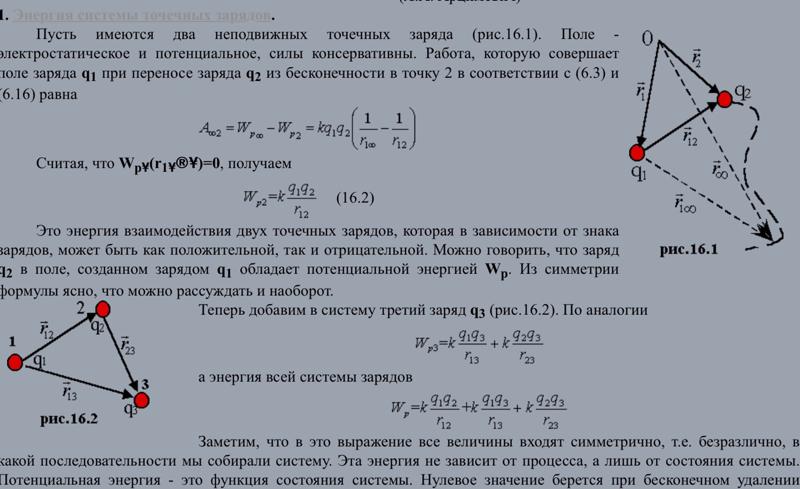 где — потенциал, создаваемый зарядами и в точке, где находится заряд .![]()
