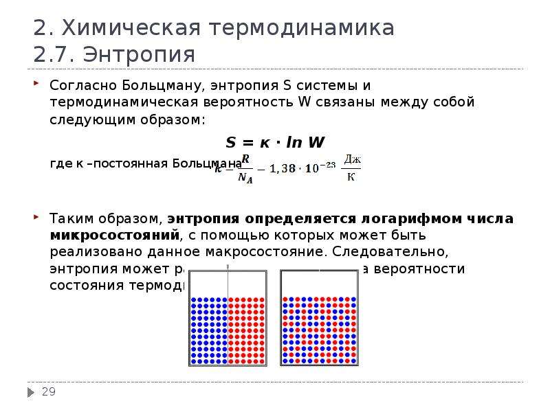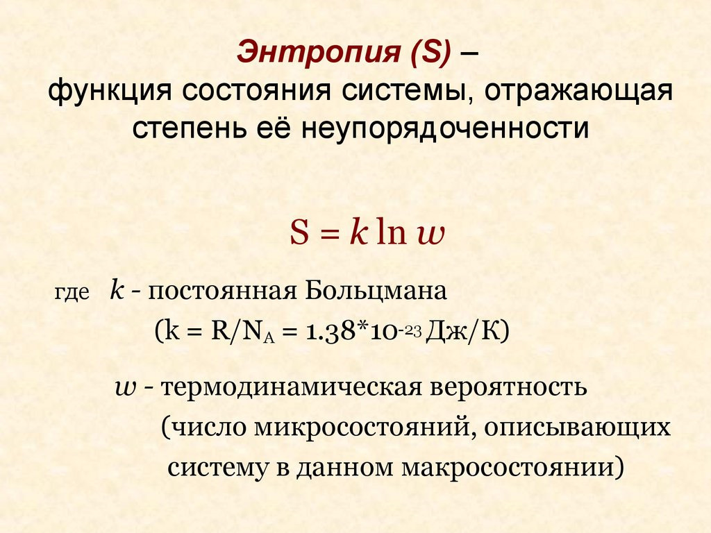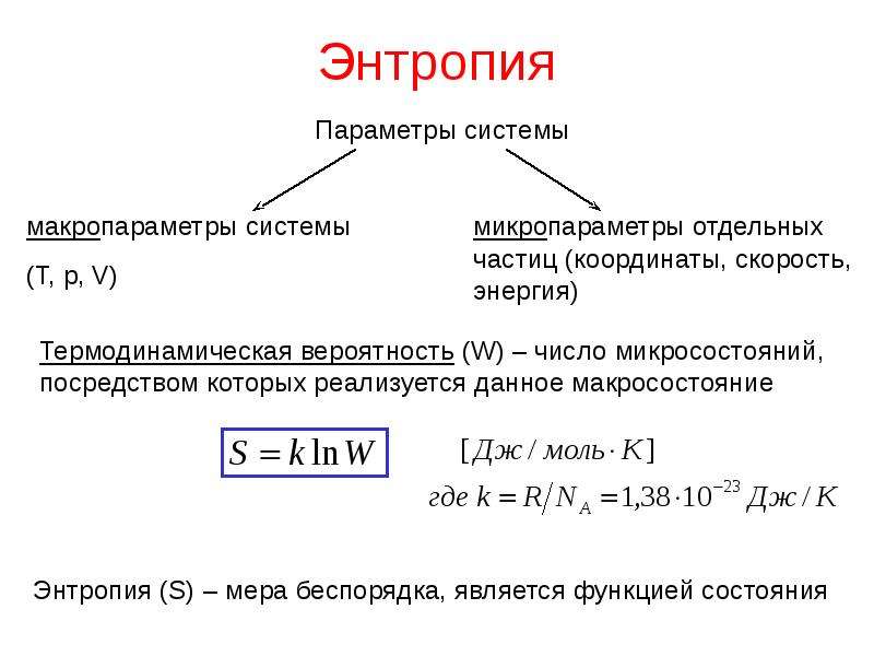- Говорят, что энтропия – мера беспорядка системы. Это статистическая интерпретация энтропии. Большее количество микросостояний, которое осуществляет макросостояние, соответствует большей энтропии.