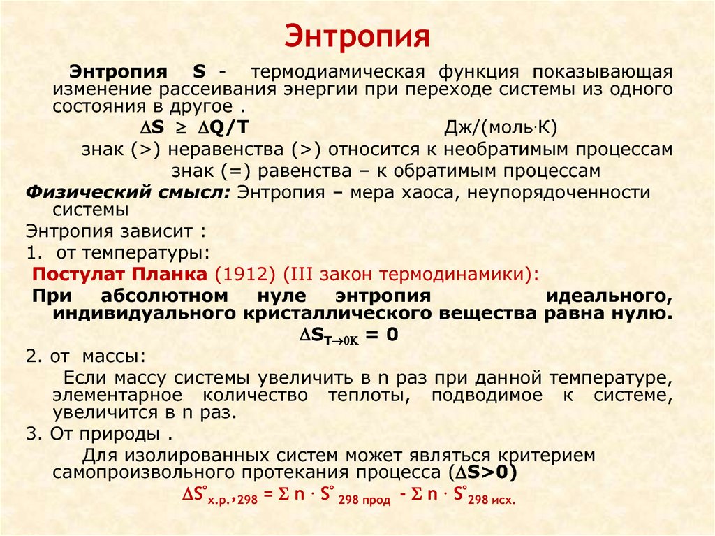 Энтропия – это функция состояния, которую часто ошибочно называют «состоянием беспорядка» системы.Качественно энтропия – это просто мера того, насколько энергия атомов и молекул становится более разбросанной в процессе, и может быть определена в терминах статистических вероятностей системы или в терминах других термодинамических величин. Энтропия также является предметом Второго и Третьего законов термодинамики, которые описывают изменения энтропии Вселенной по отношению к системе и окружающей среде, а также энтропию веществ, соответственно.