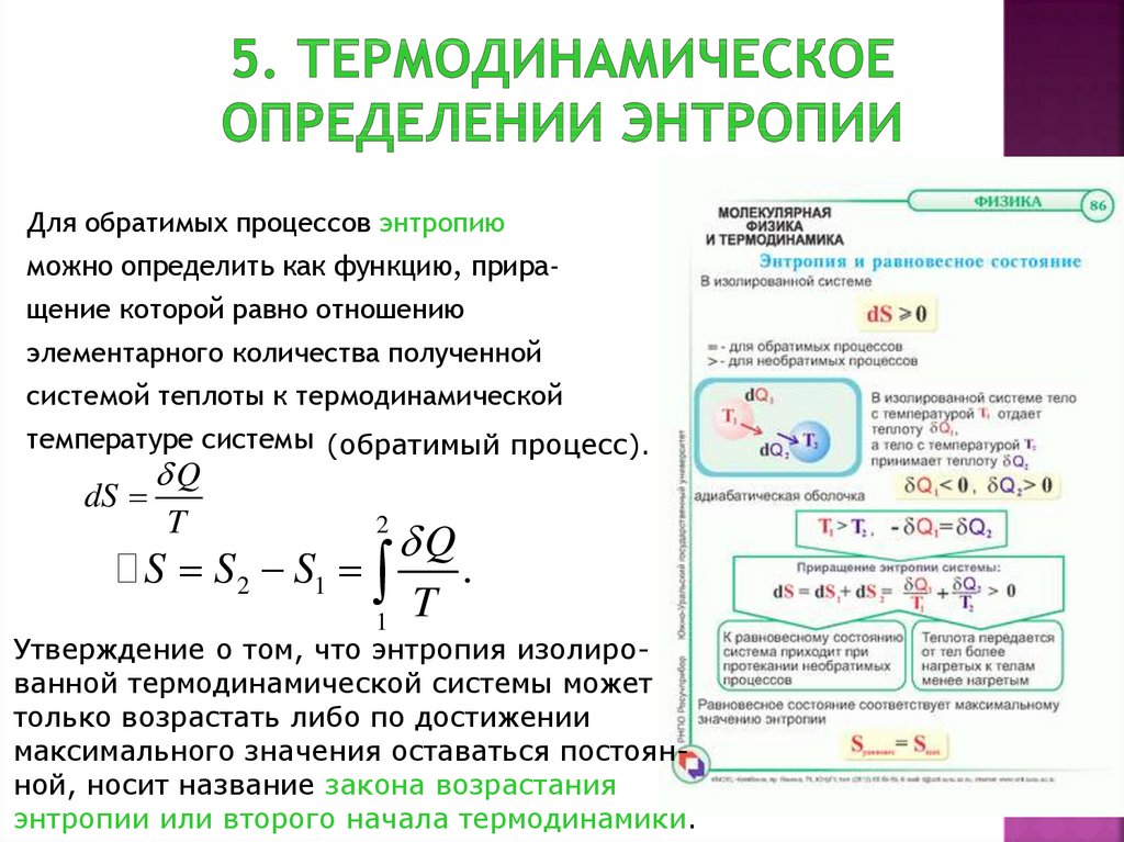 Q положительно для энергии, переданной в системе посредством тепла, и отрицательно для энергии, переданной из системе посредством тепла.В системе СИ энтропия выражается в джоулях на кельвин (Дж / К). Если температура изменяется во время процесса, то обычно хорошим приближением (для небольших изменений температуры) является средняя температура T , чтобы избежать сложных математических расчетов (расчетов).