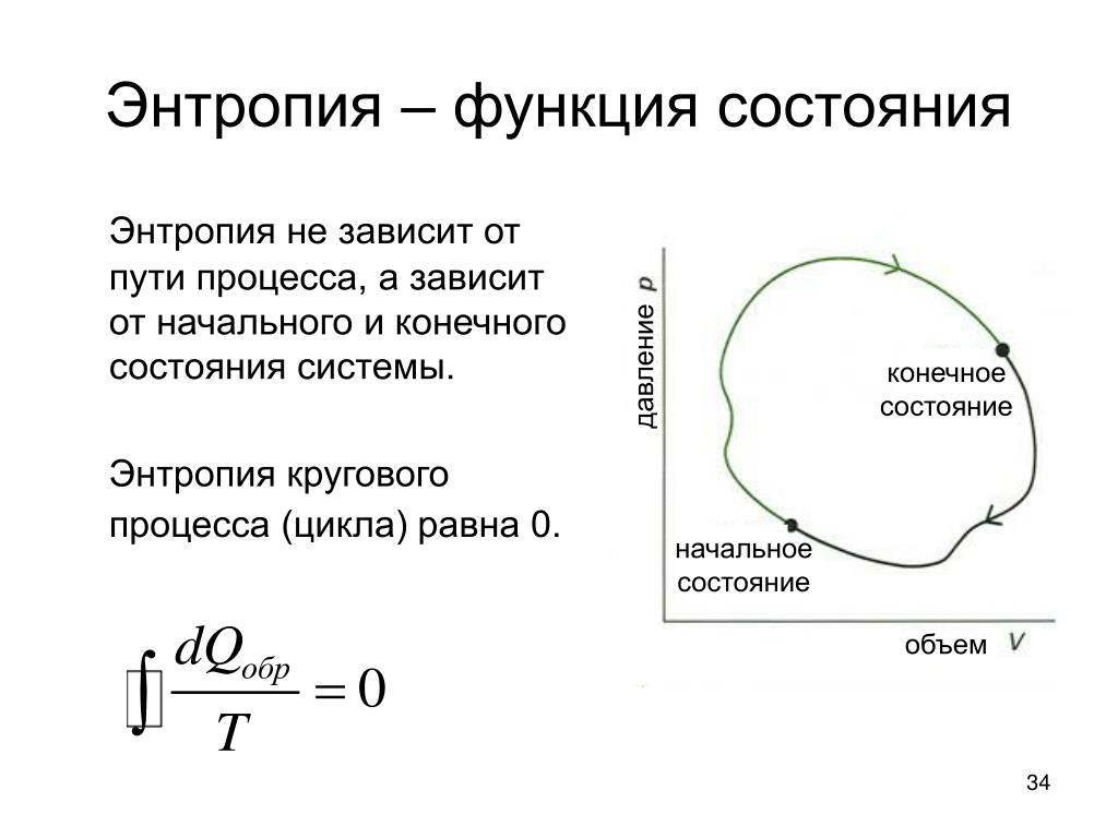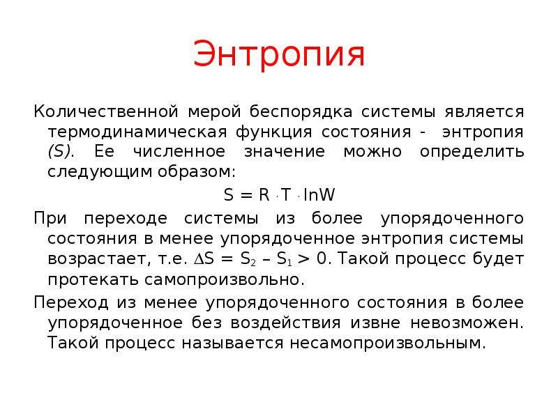- Энтропия – это функция состояния, которую часто ошибочно называют «состоянием беспорядка» системы.Качественно энтропия – это просто мера того, насколько энергия атомов и молекул становится более разбросанной в процессе, и может быть определена в терминах статистических вероятностей системы или в терминах других термодинамических величин.