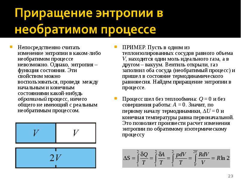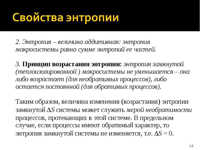 Все реальные процессы являются необратимыми, поэтому в реальности энтропия изолированной системы способна только расти. Она становится максимальной в состоянии термодинамического равновесия.