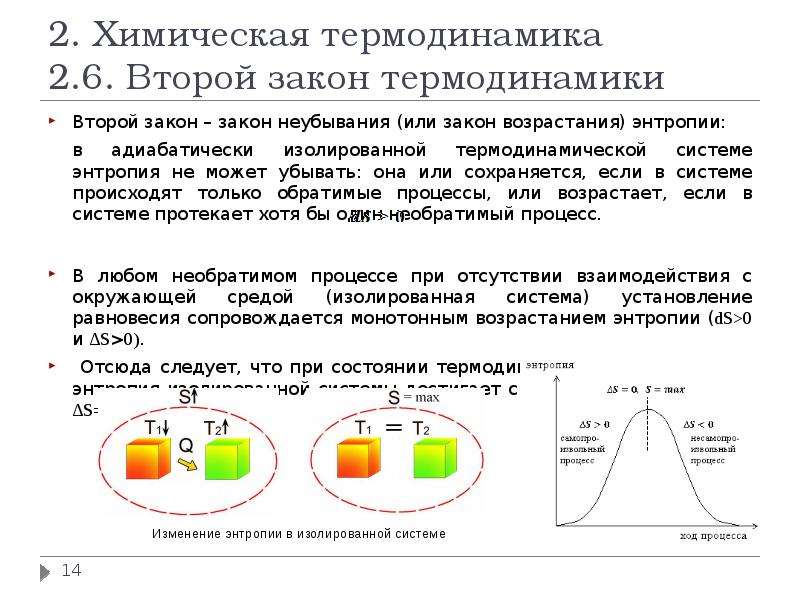 Второй закон термодинамики утверждает, что полная энтропия системы либо увеличивается, либо остается постоянной в любом спонтанном процессе; он никогда не уменьшается. Важным следствием этого закона является то, что тепло передает энергию спонтанно от объектов с более высокой температурой к объектам с более низкой температурой, но никогда самопроизвольно в обратном направлении.Это связано с тем, что энтропия увеличивается при передаче тепла от горячей к холодной (рис. 12.9). Поскольку изменение энтропии составляет Q / T , существует большее изменение ΔSΔS при более низких температурах (меньшее T ). Таким образом, уменьшение энтропии горячего (больший T ) объекта меньше, чем увеличение энтропии холодного (меньшего T ) объекта, что приводит к общему увеличению энтропии для системы.