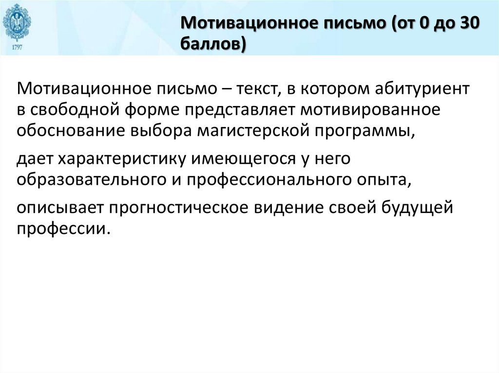 В мотивационном письме Вы коротко отражаете свою автобиографию, Ваше видение текущего состояния и перспектив развития психологии личности, психологического консультирования и психотерапии, отвечаете на вопросы: «Чем Вас привлекает эта сфера деятельности?», «Как Вы видите себя в данной сфере после окончания обучения?», «Каковы Ваши качества, знания и достижения, которые позволят Вам успешно обучаться на этой магистерской программе и развиваться в выбранной Вами сфере деятельности?» Кроме того, в мотивационном письме Вы можете сообщить о себе всё, что сочтете нужным.