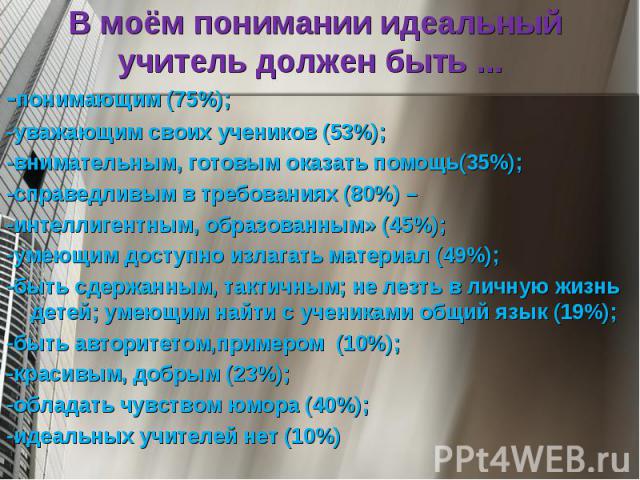Изменяется роль руководителя в системе управления. Очевидно, что не только настоящее, но и будущее состояние образовательного учреждения во многом зависит от личных качеств, знаний и способностей руководителя, его умения организовать работу коллектива и стремления достичь наилучших результатов. Сейчас я попробую составить портрет идеального руководителя.