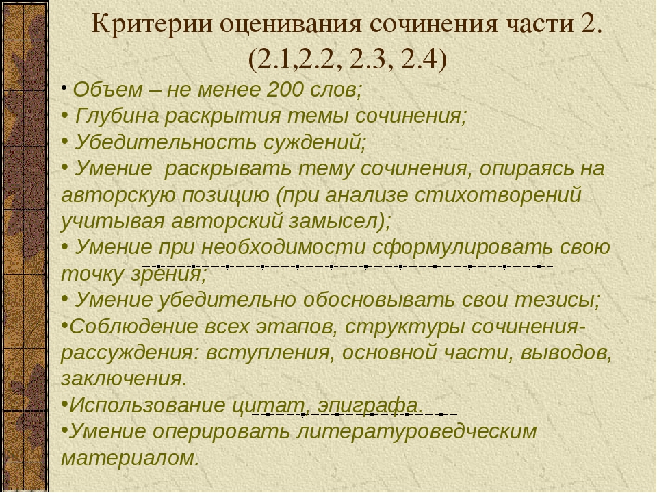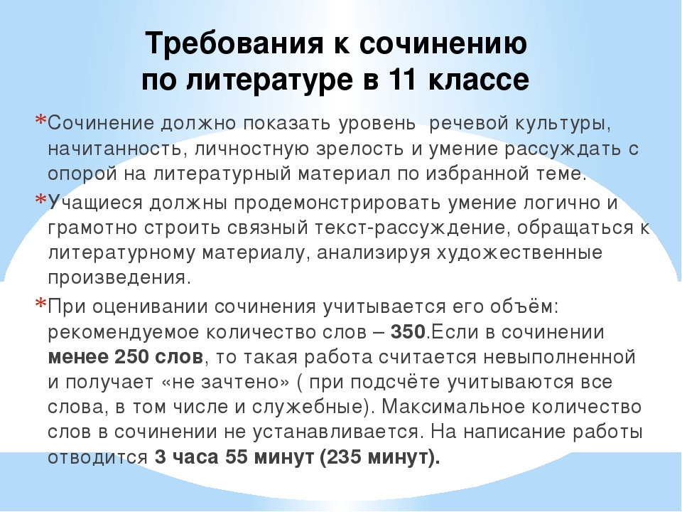 При оценке сочинения в первую очередь учитывается соблюдение требований объёма и самостоятельности написания сочинения, соответствие выбранной теме, умение аргументировать позицию и обоснованно привлекать литературный материал.