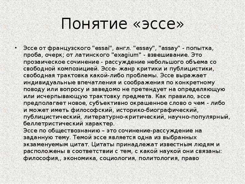 Понятие эссеЭссе обладает своей спецификой, которая проявляется в следующем:
