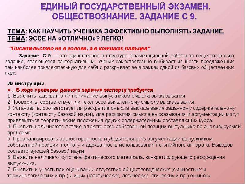 В эссе важно показать свою позицию, обосновать: что, как, почему и зачем. Здесь важно не ответить на конкретный вопрос, а отстоять свое мнение.