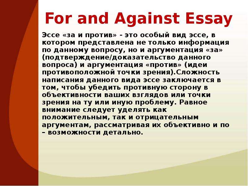 - Своеобразный стиль изложения текста. Эссе предполагает написание текста в разговорном стиле, но строго в рамках культуры, этики и приличия.