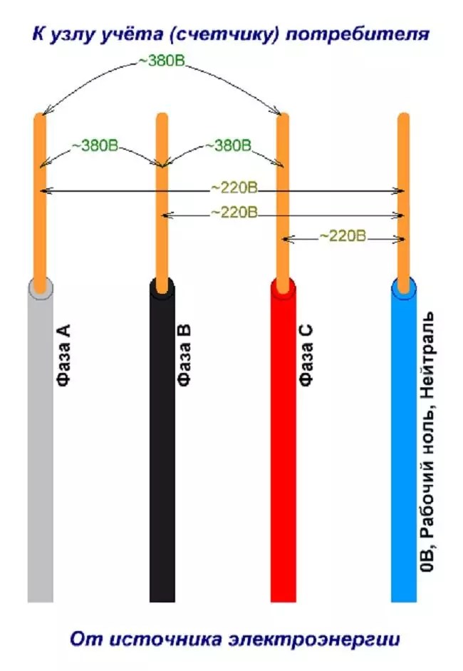 В трехфазной цепи уровень напряжения между любыми двумя фазами составляет 380 В, между фазой и нулем – 220 В.