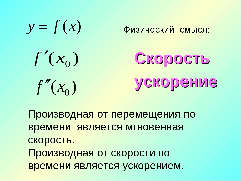 Физический смысл производной это скорость (скорость движения, скорость изменения процесса, скорость работы и т.д.)