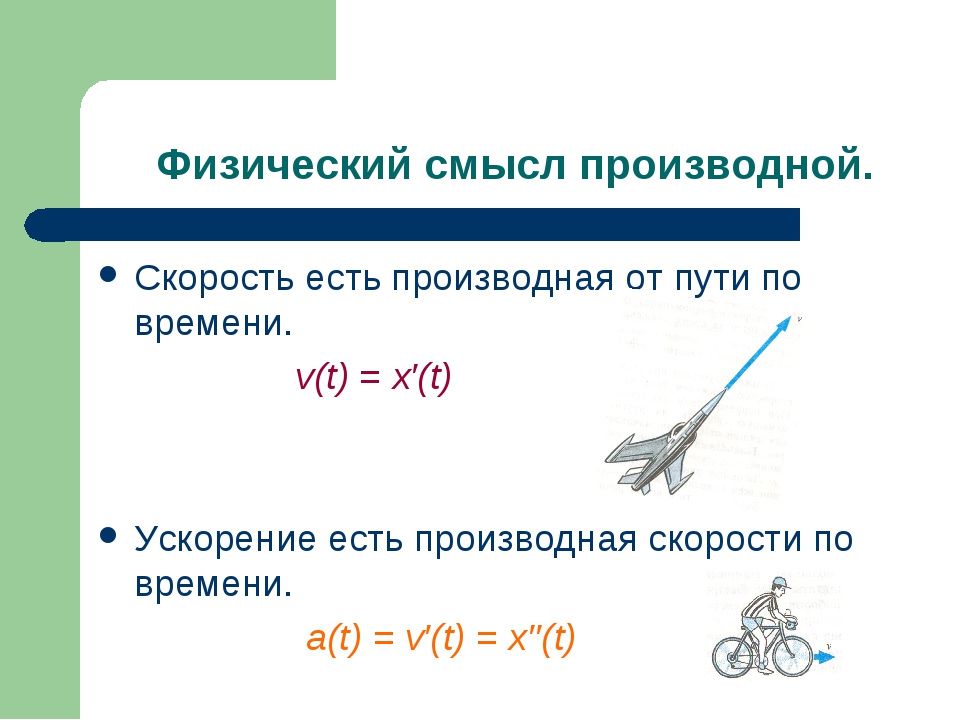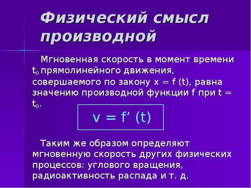 Физический смысл производной обозначился ещё с практических задач мгновенной скорости, прямолинейного движения и даже свободного падения.