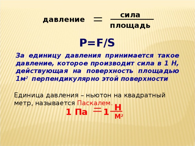 1. Давление — это физическая величина, равная отношению силы давления к площади поверхности.