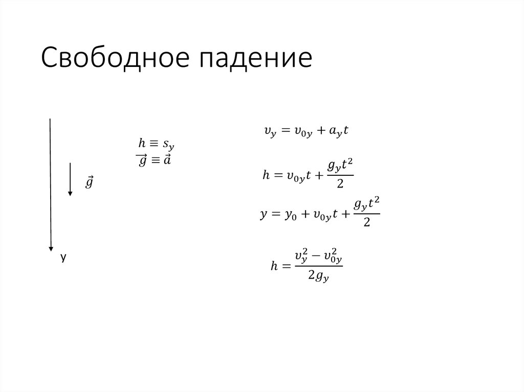 Существуют простые уравнения для падающих объектов, которые позволяют вычислить скорость, которую объект достигает для данного перемещения или времени.Уравнения: