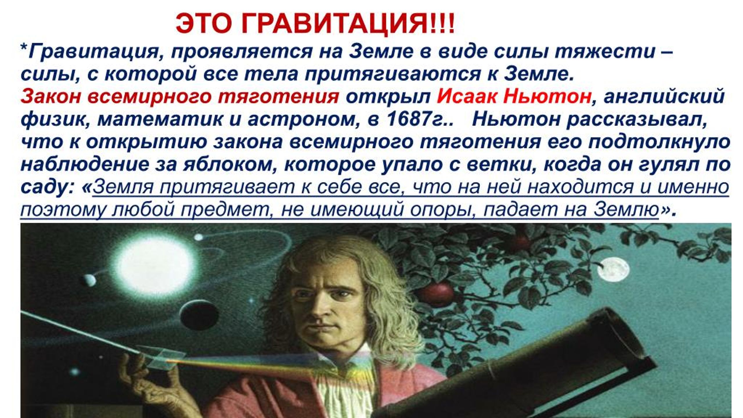Гравитация — это притяжение между двумя объектами, которые обладают массой или энергией. Каждый наблюдал это фундаментальное воздействие и благодаря нему человек может сидеть, стоять или лежать. Гравитационная сила проявляется в падении камня с обрыва; движении планеты вокруг звезды; морских приливах, за которые отвечает Луна.