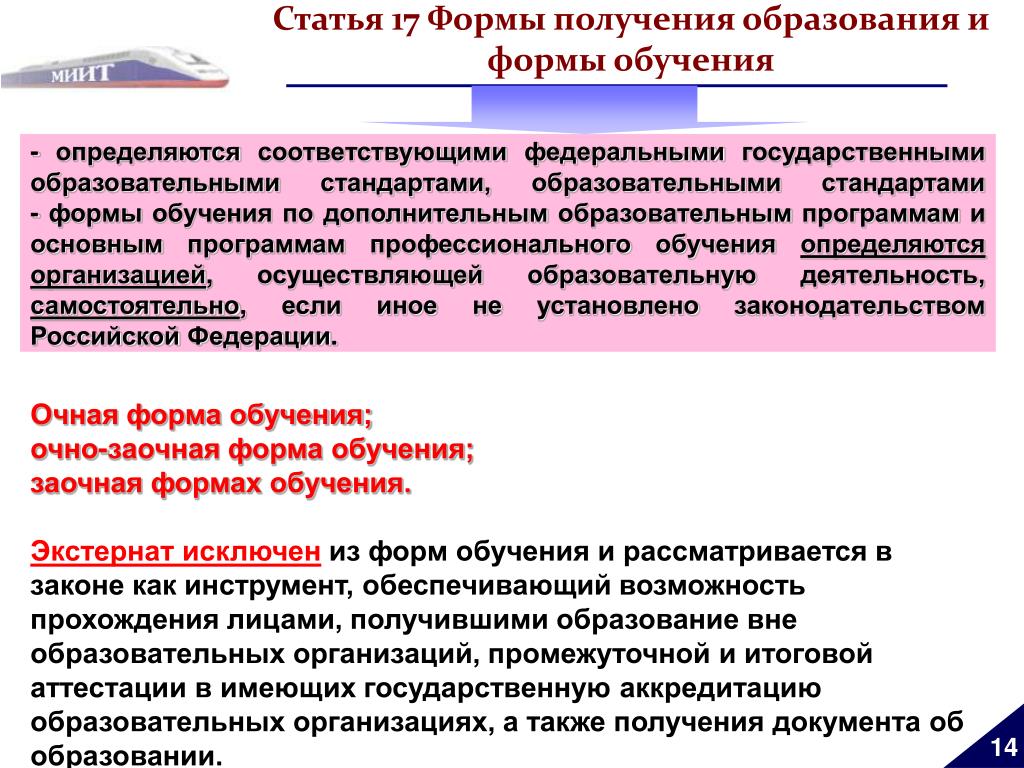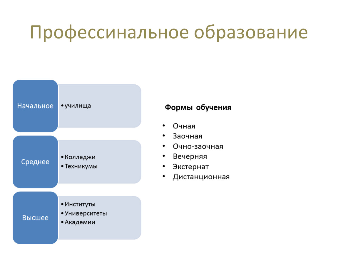 В Российских ВУЗах существует несколько форм обучения: очная (дневная), очно-заочная (вечерняя) и заочная.