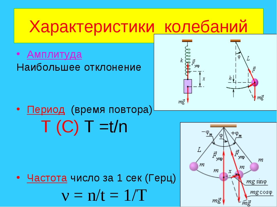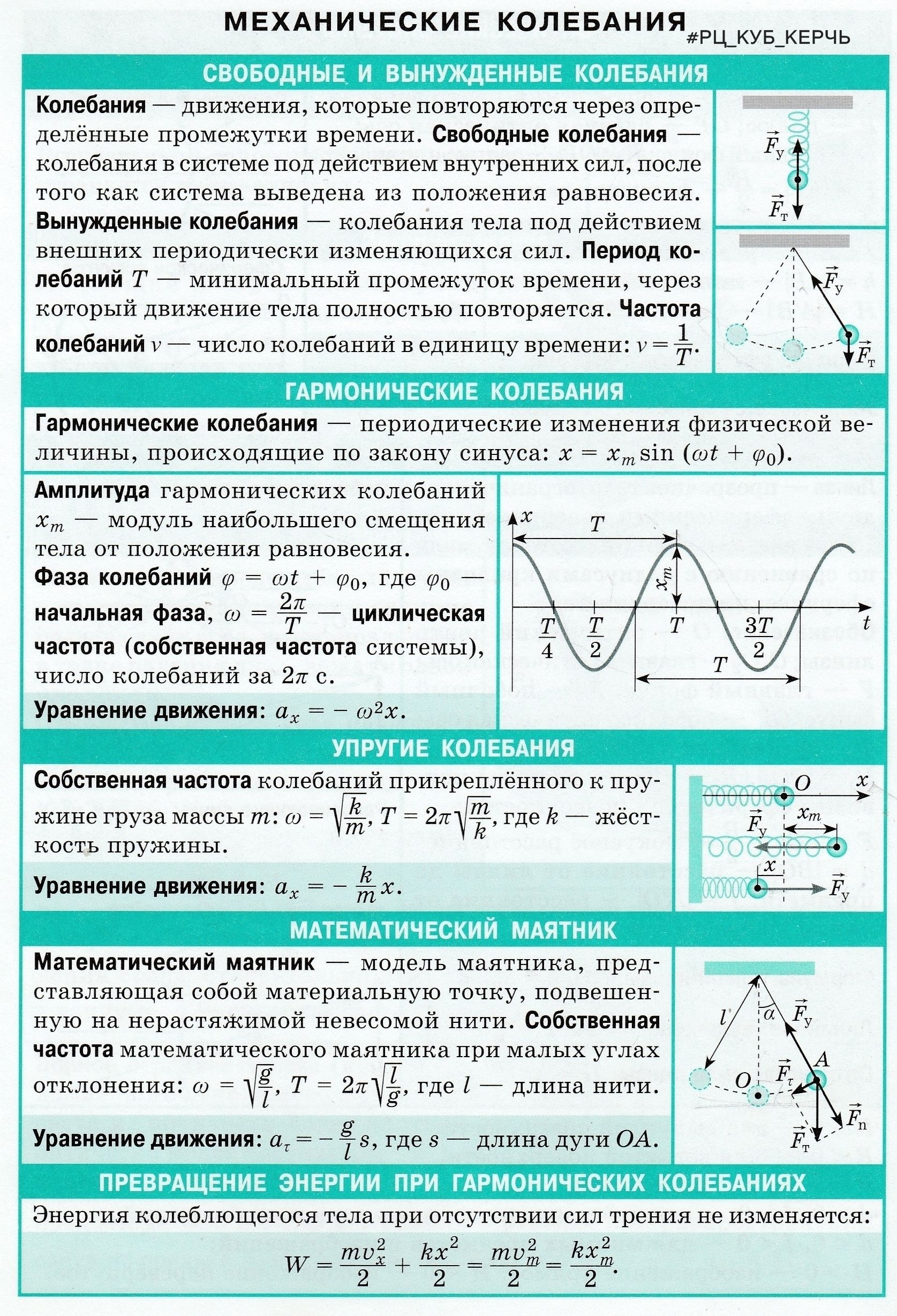 Механические, периодические колебания, характеристики: частота, период, фаза, амплитуда, Виды колебаний, резонанс, примеры