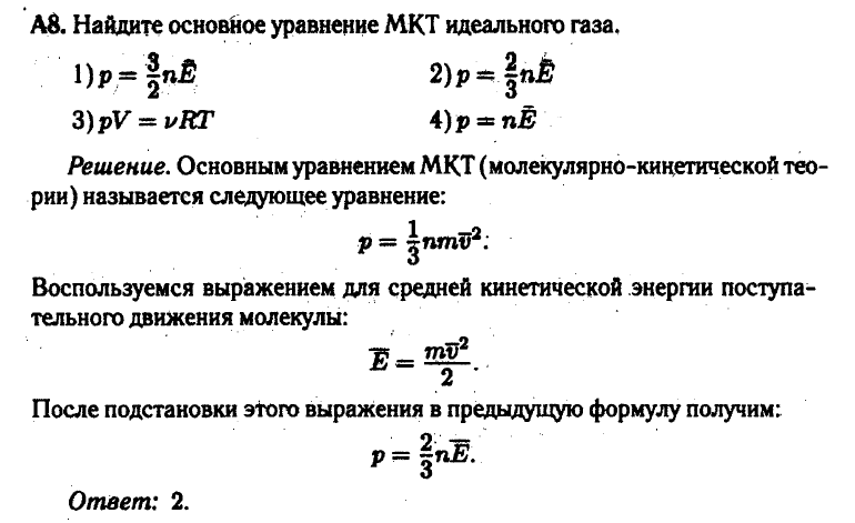 Основное уравнение молекулярно-кинетической теории идеального газа связывает макроскопический параметр газа — давление — с параметрами его молекул: с концентрацией, массой и средней скоростью. Поскольку масса и средняя скорость молекулы однозначно определяют среднюю энергию молекулы, основное уравнение МКТ можно записать с помощью средней энергии.