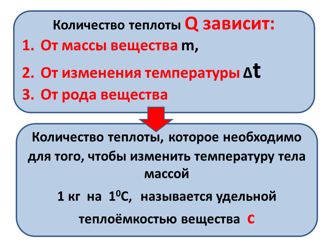 Из формулы видно, что количество теплоты зависит от массы тела, разности температур в конечном и начальном состояниях, а также от удельной теплоёмкости вещества, из которого это тело изготовлено.