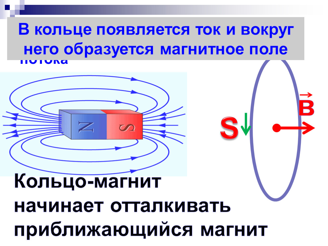 Индукция магнитного поля, создаваемого постоянным магнитом, уменьшается с увеличением расстояния до него. Поэтому при приближении магнита к кольцу (задача 23.1.3 ) поток индукции магнитного поля магнита через кольцо изменяется, и в кольце возникает индукционный ток. Очевидно, это будет происходить при приближении магнита к кольцу и северным, и южным полюсом.