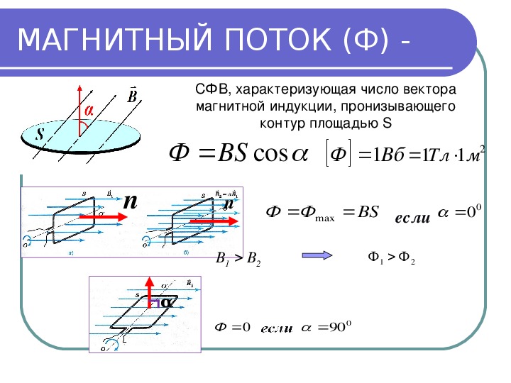 где – индукция поля, – площадь контура, – угол между вектором индукции и нормалью (перпендикуляром) к плоскости контура (см.