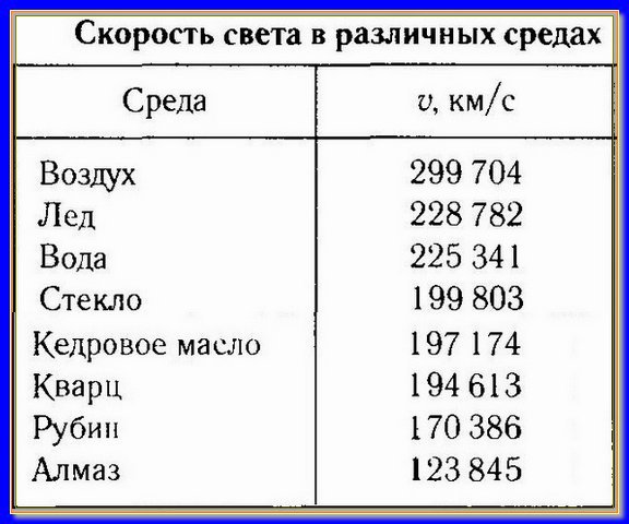 Ниже представлена таблица скоростей света в разных средах и показателей преломления в них.