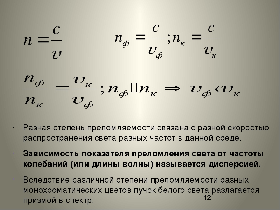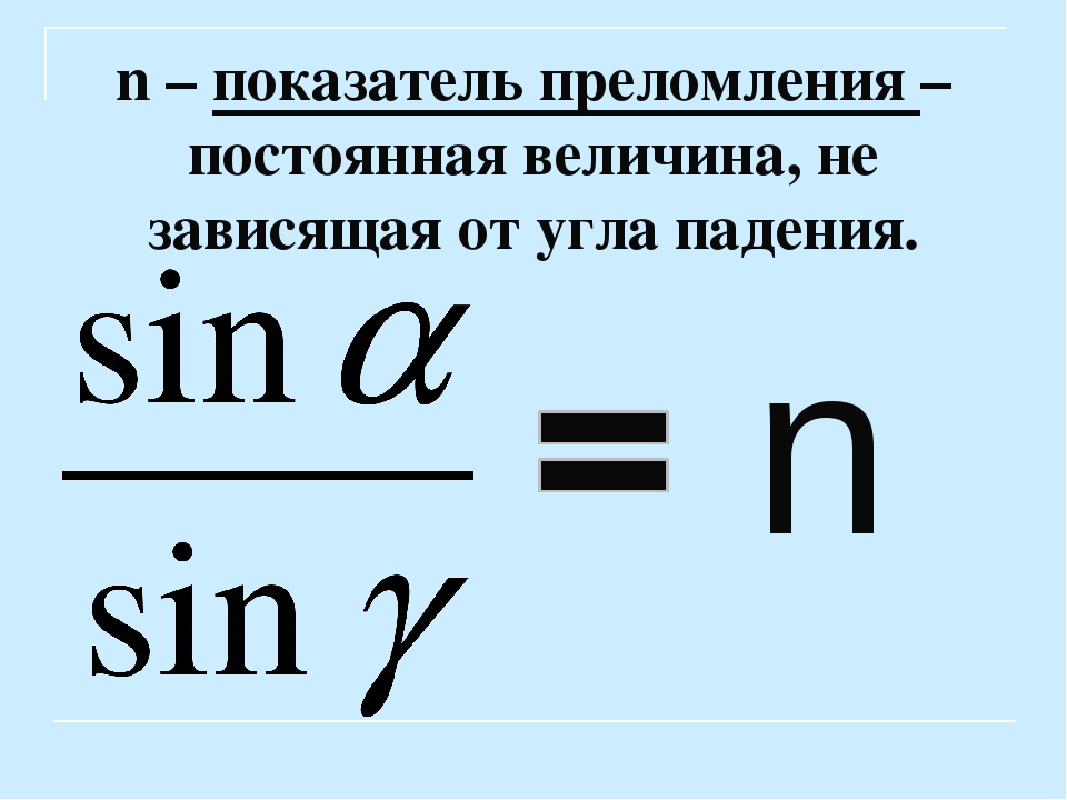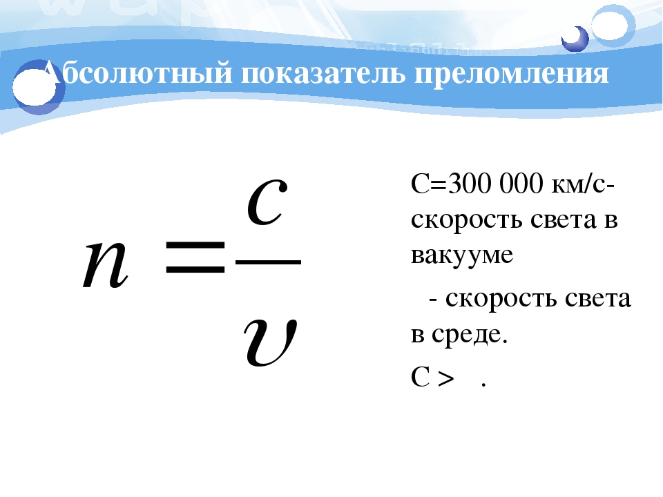 Когда ученые говорят о преломлении, они используют формулу. «n = c/v» «c» — скорость света в вакууме , «v» — скорость света в этом веществе, а «n» — показатель преломления . Согласно формуле, показатель преломления есть отношение скорости света в вакууме к скорости света в веществе.Но что такое преломление? Когда свет переходит из одного вещества в другое, он меняет скорость и направление . Это изменение направления называется преломлением. Некоторыми показателями преломления являются алмаз (2,419), стекло (1,523) и вода (1,33).