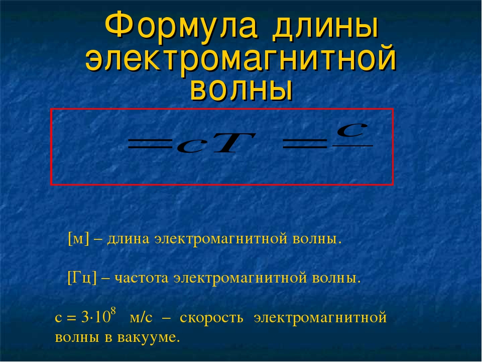 Связь между частотой (количество гребней волны, проходящих через определенную точку за заданный промежуток времени) и длиной волны электромагнитных волн определяется формулой c = λ f , где c — скорость света, λ длина волны в метрах, а f равно частоте в циклах в секунду.