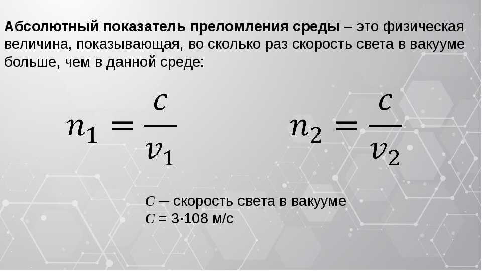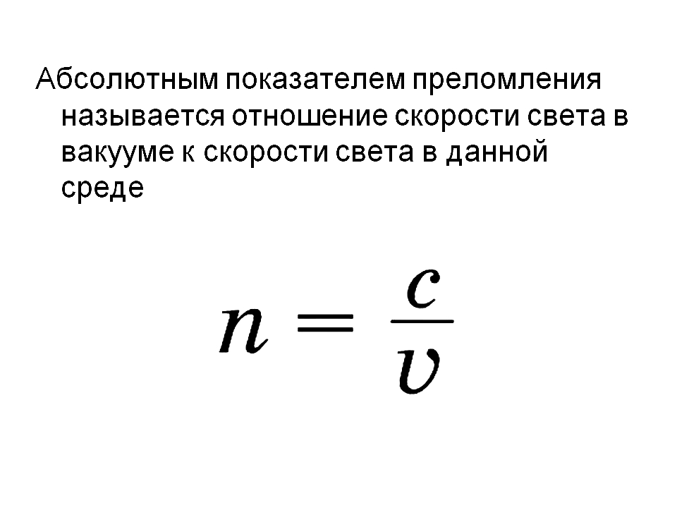 Основной характеристикой в данном случае служит показатель преломления среды. Он равен отношению скорости света в вакууме к скорости распространения света в среде.