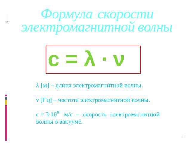 Формула скорости света c = λ/T с — скорость света [м/с] λ — длина волны [м] T — период [с] |