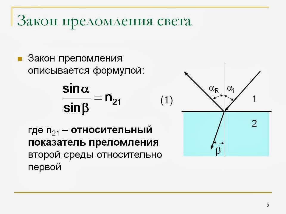 В любой прозрачной среде свет распространяется медленнее. Его скорость v зависит от показателя преломления среды n: v = с/n . Показатель преломления воздуха – 1,0003, воды – 1,33, различных сортов стекла – от 1,5 до 1,8.