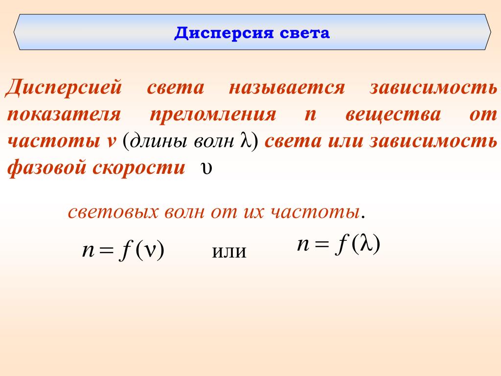 При распространении света в среде различают две скорости – фазовую и групповую. Фазовая скорость vф характеризует перемещение фазы идеальной монохроматической волны – бесконечной синусоиды строго одной частоты и определяет направление распространения света. Фазовой скорости в среде соответствует фазовый показатель преломления – тот самый, значения которого измеряются для различных веществ. Фазовый показатель преломления, а следовательно, и фазовая скорость зависят от длины волны. Эта зависимость называется дисперсией; она приводит, в частности, к разложению белого света, проходящего через призму, в спектр.